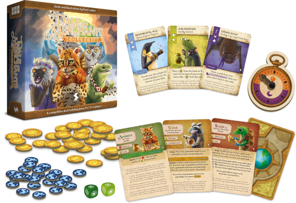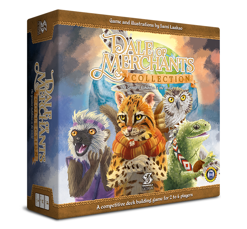 Dale of merchants est un jeu de type construction de deck né du génie créatif de Sami Laakso. Publié par Snowdale Design, la série de trois jeux Dale of merchants inclus chacun de nouveaux (6) decks thématiques. Le jeu Dale of merchants collection que j’ai testé inclus 8 decks thématiques, une boite plus grosse ainsi qu’un lot de diviseur personnalisés représentant l’entièreté de la collection des jeux! De quoi y ranger toute la série qui au final compte 26 decks à thématiques animales. Bon, c’est bien les chiffres mais qu’est-ce que c’est Dale of Merchants ?