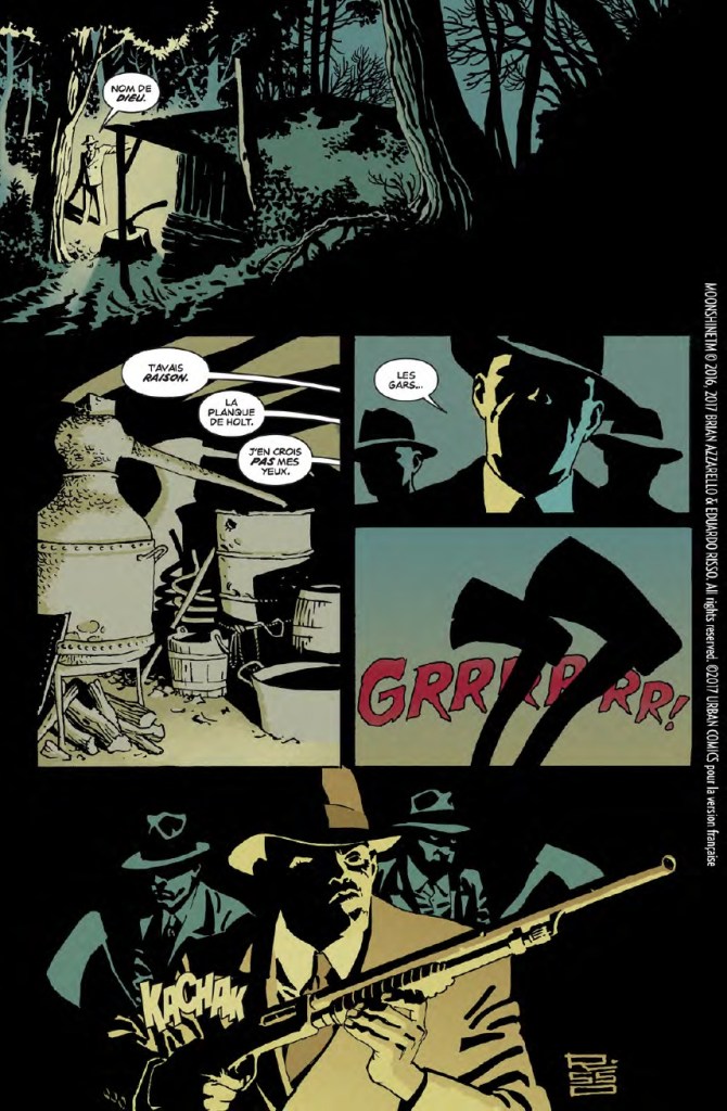 Moonshine est un très bon thriller alliant réalité et surnaturel de Brian Azzarello dépeignant des personnages forts intéressants assez rapidement. On s’attache à Lou Pirlo ainsi qu’à la famille Holt. Un premier tome qui met promet pour la suite!