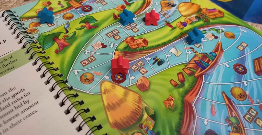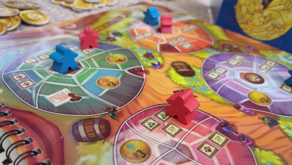 Almanac – The Dragon Road est un jeu de placement d’ouvrier pour 2 à 4 joueurs dans lequel vous incarnez un marchand avec sa caravan, acquérant et revendant des marchandises au cours d’une épopée livresque. C’est-à-dire que les 6 rondes de placement d’ouvrier se feront à travers différentes pages d’un grand livre. Chaque page représente un nouveau lieu avec sa propre mécanique. À la fin d’une ronde, les joueurs devront miser pour devenir le premier caravanier et ainsi choisir entre deux pages du livre. Chaque lieu est unique et une description en lien avec la thématique vient donner un peu d’immersion. Les mécaniques sont très claires et bien qu’assez simple, permettent un bon niveau de stratégie.