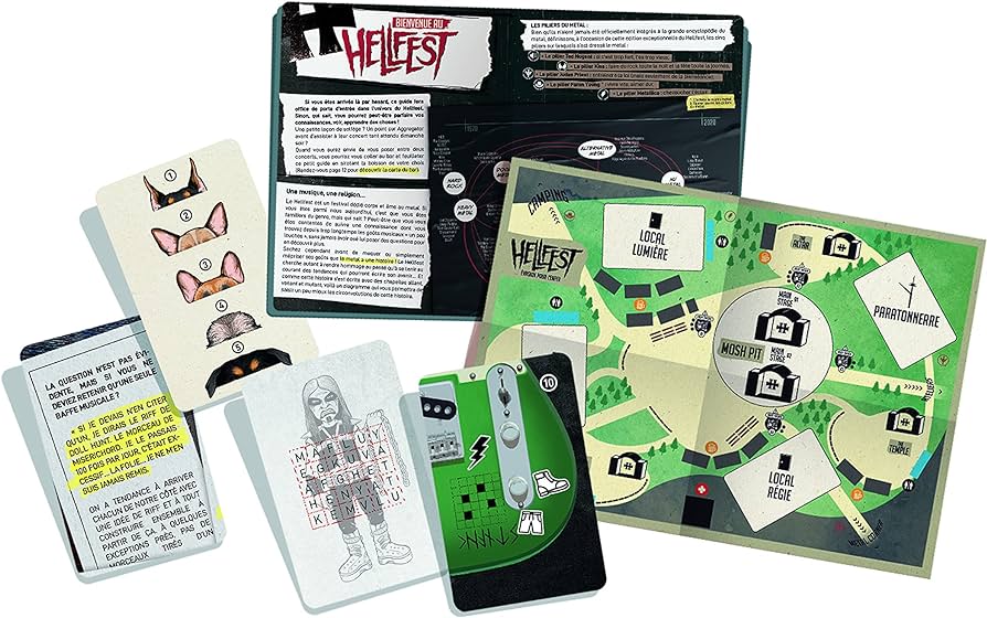 Hellfest escape game est un jeu d’Escape Room complètement brisé dans sa forme actuelle. L’idée était pourtant intéressante et la facture visuelle des cartes et des éléments est vraiment bien. Il s’agit donc d’un jeu ou vous aurez à résoudre des énigmes pour sauver le Hellfest en raisonnant le chanteur d’un des fameux groupes de métal vedette de l’événement. Une des particularités intéressante est l’ajout de carte de personnage avec différents pouvoirs que vous pouvez utiliser au cours des parties. Un maitre de jeu doit d’abord cacher des cartes dans différentes pièces qui correspondront aux différentes section du site du Hellfest. Les joueurs devront trouver les cartes et résoudre les énigmes qu’elles proposent. On vous demandera d’abord en guise d’énigme brise-glace d’obtenir votre pass pour l’arrière scène, afin de vous promener partout sur le terrain du Hellfest.