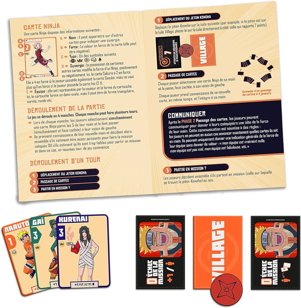 Un jeu de carte coopératif ou les participants devront assembler des équipes de ninja assez puissante pour faire un maximum de mission en 4 rondes. Le jeu est simple, vous allez recevoir des cartes ninja et évaluer chacun votre score de puissance. Ensemble, vous allez devoir communiquer à savoir si vous croyez que votre total de puissances, la puissance de chacune de vos équipes, est assez forte pour accomplir une mission. Si vous n’êtes pas certains, vous prenez une carte de votre équipe et faites circuler à gauche. Une nouvelle fois, vous comptabilisez votre score et discuter, sans dévoiler votre score mais juste assez pour faire comprendre ou vous vous situez en terme de puissance.