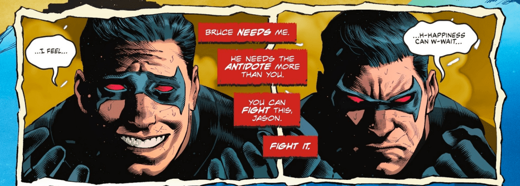 On retrouve ici un Red Hood pourchassé par son passé, anti-héro parfait confronté à des dilemmes moraux intenses et surtout, à un Batman paternaliste. La nouvelle drogue en ville qui fait halluciner des moments d’euphories et de joies intenses n’a pas que des bienfaits. Elle laisse souvent les gens dans des comas ou complètement inconscient de l’environnement qui les entourent. Une puissante drogue qui n’est pas sans rappeler le gaz de terreur employé par Jonathan Crane, l’Épouvantail. Les deux héros tentent donc de remonter la piste de cette mystérieuse nouvelle drogue, chacun à leur manière. Ils finiront par se piler sur les pieds, devoir coopérer, et même se sauver l’un l’autre dans une histoire qui utilise savamment plusieurs personnages et vilains de l’univers de la Chauve-Souris.