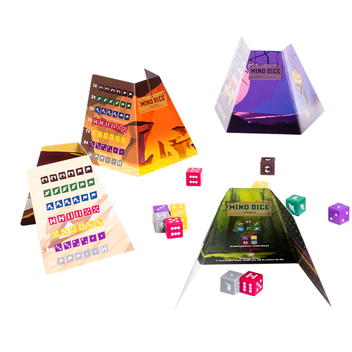 Mino Dice est un jeu de dés dans lequel vous devez parié sur le nombre de plis que vous allez remporter en fonction des dés que vous pigez. Chaque joueur (entre 3 et 6) pige dans le sac le nombre de dés correspondant à la manche (1 dé pendant la première et un de plus à chaque nouvelle manche, jusqu’à 8 à la huitième manche). Le joueur prend alors connaissance de ses dés en secret derrière un paravent. Les dés se déclinent en 2 catégories: les dés spéciaux et les dés numériques. Pour les dés numériques, le plus gros nombre l’emporte, alors que les dés spéciaux l’emportent toujours sur les dés numériques. Ces dés spéciaux ont des faces de créatures mythiques et sont plus rares que les dés à numéros.