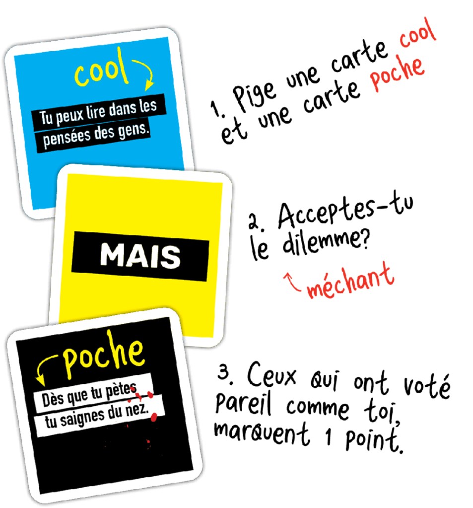 Avec du recul, je dirais qu’il s’agit d’une variante du jeu Pick Your Poison, mais avec une séquence de positivité dans les choix du joueur. Le jeu, conçu pour trois joueurs ou plus, promet de colorer vos soirées entre amis ou en famille. Bien que les déclarations des joueurs puissent parfois sembler étranges, le premier joueur doit prendre la carte du « MAIS », tandis que les joueurs à droite et à gauche piochent trois cartes de bons dilemmes et trois de mauvais dilemmes. Ensuite, les joueurs essaient de présenter simultanément le meilleur et le pire dilemme. Les autres participants doivent deviner si le possesseur de la carte « MAIS » accepterait le dilemme en levant la main, et ceux qui réussissent obtiennent un point.