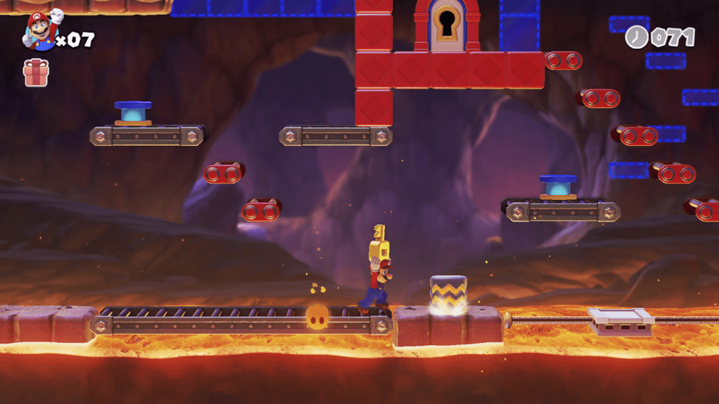 Mes parties du jeu original sur Game Boy Advance datent de 2004, donc il est difficile de les comparer. Cependant, le remake offre une expérience plaisante avec des mécanismes supplémentaires à chaque niveau. Le jeu compte huit mondes, chacun ayant huit niveaux (un total de 130 niveaux, en comptant le NG+), incluant le boss qui sera toujours Donkey Kong. L’histoire suggère que Donkey Kong aurait volé des mini-jouets à l’effigie de Mario, et vous, en tant que Mario, devez les délivrer et vaincre le vilain Donkey Kong.