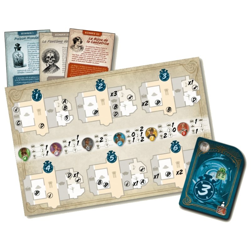 Pour recueillir des indices, les joueurs doivent superposés des cartes représentant les différentes salles de l’Opéra avec l’une des plaquettes personnages (une pour chacun des 6 personnages) ou l’une des cartes temps (une pour chacun des 6 temps). Ce faisant, le joueur peut tenter de déterminer les mouvements d’un personnages à travers l’Opéra durant les 6 temps que durent le scénario. L’objectif est de trouver à quel moment et dans quel lieu la victime se retrouve seule avec un autre personnage. Ainsi, on pourra trouver le coupable.