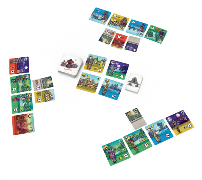 On continue ainsi jusqu’à ce que 8 cartes régions ont été jouées. On retourne alors les cartes régions à l’envers, pour les révéler ensuite en commençant par la fin. Car la twist de Faraway, c’est que le décompte de point se fait en commençant par la dernière carte placée. Il ne s’agit dont pas de chercher à marquer des points avec les derniers lieux, mais plutôt de maximiser l’impact des premières cartes placées et de construire en fonction d’elles. Les points sont donnés selon les couleurs des cartes et les symboles qui y sont présents.