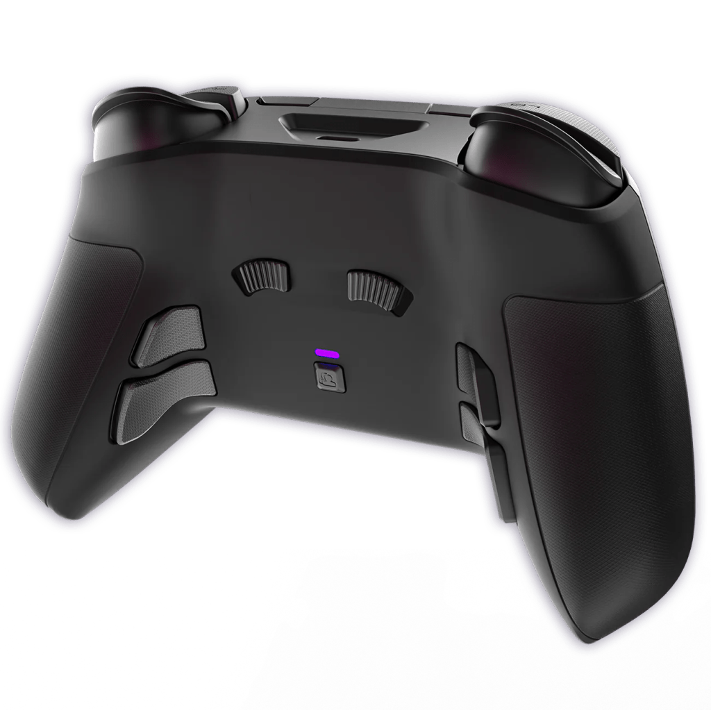 Un port jack de 3.5 mm est aussi situé sous la manette. Si vous utilisez un casque Bluetooth connecté à votre console ou votre PC, vous n’avez pas à vous inquiéter ; la connexion se fait parfaitement. Tous les boutons d’une manette Xbox régulière sont présents ici. La manette dispose de six boutons supplémentaires en dessous, vous permettant de la configurer à votre convenance. Un septième bouton est également présent pour sélectionner le profil désiré. Par exemple, si vous avez une configuration spécifique pour jouer à Call of Duty et une autre pour Forza, le bouton de profil vous permettra de passer facilement d’une configuration à l’autre. Je vous ai mentionné le port jack ; sachez qu’elle est compatible avec Dolby Atmos Spatial, un petit plus que de nombreux casques n’ont pas. De plus, une application est disponible pour vous aider à configurer vos profils, et elle est très pratique.