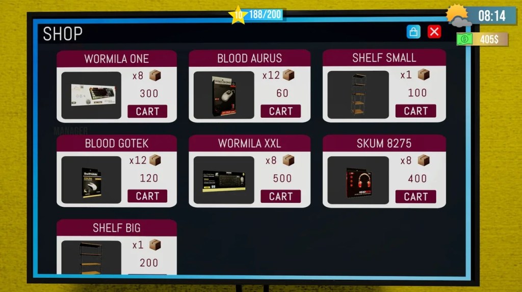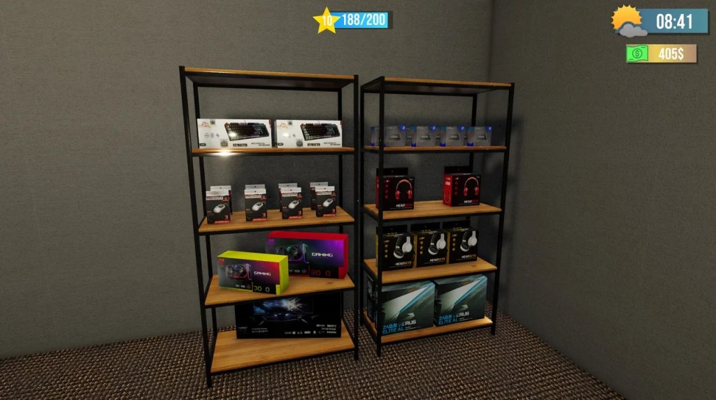 En ce qui concerne le stockage, tant que vous n’avez pas débloqué l’entrepôt, vous vous retrouverez à entasser vos produits dans des boîtes, ce qui devient rapidement encombrant. Vous démarrez avec peu d’argent, et les étagères coûtent très cher. Ainsi, il faut être très prudent dans vos dépenses en début de partie.