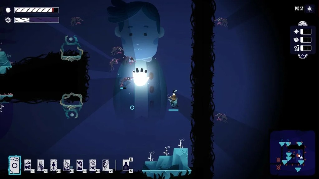 L’aspect psychologique est beaucoup mis de l’avant dans Ghostboy. Chaque compétence que vous équipez avant de débuter un niveau affecte la santé mentale de la personne que vous tentez d’aider. Vous devez donc être certain de n’utiliser que ce que vous avez réellement besoin. Après chaque niveau, vous avez une séquence de réflexion par le personnage où vous pouvez l’inciter à agir d’une certaine façon pour mieux passer à travers son deuil. Les décisions que vous prenez ne seront pas sans conséquences, car elles affecteront les ennemis que vous rencontrerez dans les niveaux, et les compétences que vous pourrez utiliser ou non.