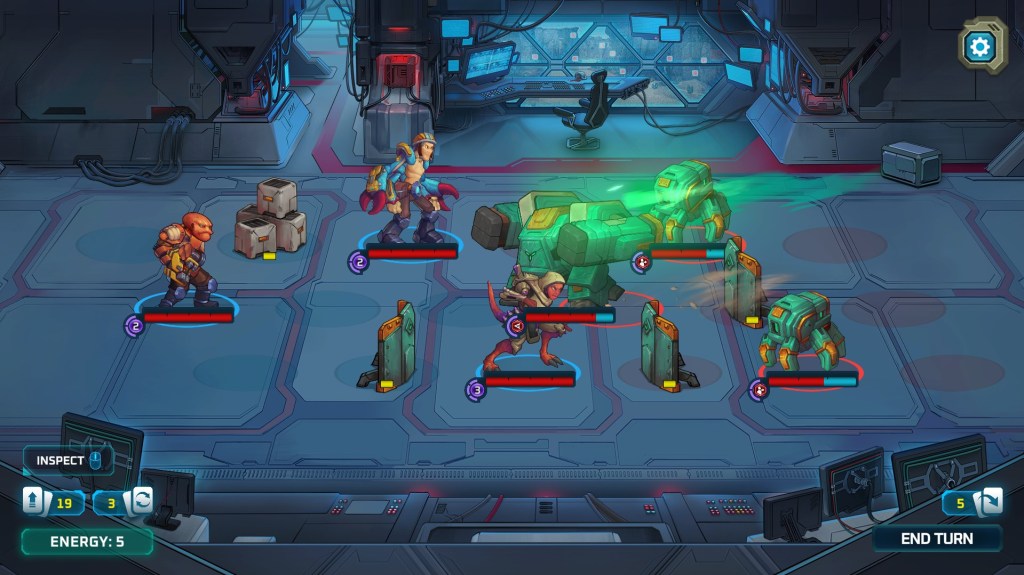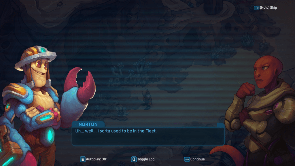 Dans un monde futuriste, sur une planète éloignée, une colonie minière est sous attaque d’envahisseurs. Squig et Norton, deux collègues à la mine, se retrouvent au centre du conflit bien malgré eux. L’aspect RPG du jeu vous permet d’explorer le monde avec votre groupe (qui s’agrandira en avançant dans le jeu) et de récolter des ressources qui vous permettra d’améliorer vos cartes. L’histoire est somme toute intéressante, et les nombreux personnages que vous rencontrerez au fil du scénario apportent tous quelque chose à l’ensemble. L’aspect deckbuilder est cependant ce qui m’a le plus intrigué dans le jeu. Chaque personnage commence avec un deck de base constitué de cartes qui leur sont propres. Par exemple, Norton a la possibilité de se charger pour augmenter la puissance de ses attaques. Agama, de son côté, est un personnage plus sournois et n’hésite pas à utiliser des poisons pour vaincre ses ennemis. En avançant dans le jeu et en utilisant les ressources retrouvées dans le monde, vous pourrez améliorer ces cartes et également en ajouter de nouvelles `à votre deck. L’intérêt réside dans le choix des cartes de votre deck, mais aussi dans les personnages que vous voudrez inclure dans votre party, et des combinaisons qui s’offriront à vous. Les combats incorporent également une notion de positionnement, qui sera cruciale à maîtriser pour avancer; d’ailleurs plusieurs de vos cartes ne sont réellement efficaces que si votre personnage est bien positionner sur la grille.