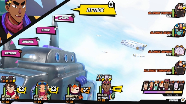 L’histoire de son côté est assez simple. Le jeu s’ouvre sur la disparition du père de Glenn, l’un des protagonistes. On se retrouve quelques temps plus tard, avec Glenn et Fio (l’autre protagoniste en importance) à retrouver vos coéquipiers de vol pour une dernière mission. La mission ne se passera pas comme prévu, et de là la trame principale va se mettre en marche. Rien d’exceptionnel dans le récit ou dans le développement des personnages, qui sonnent tous pareil. « Sonne » est une façon de parler, car le jeu est dénué de voice acting, mis à part pour quelques séquences de combat.