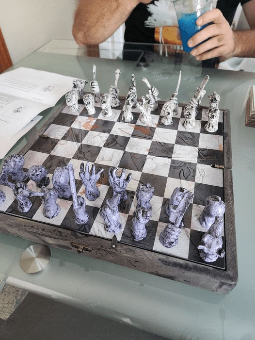 Ce jeu peut sembler simple au premier abord, malgré le niveau d’esthétisme élevé que le créateur lui a donné. Pascal DeChamplain, également tatoueur, a décoré tout le jeu de ses illustrations, qui ornent à la fois le plateau et le livret de règles. Les pièces de jeu sont moulées à partir de sculptures qu’il a réalisées et peintes à la main, bien qu’une version à peindre soi-même soit prévue. Deux autres versions sont aussi planifiées : une édition dans un coffret en bois peint et fait à la main, et une autre, plus abordable, dans une boîte en carton. Rien n’est bâclé dans l’aspect visuel du jeu, tout comme les règles que nous avons testées à travers plusieurs parties. Les règles sont simples à comprendre tout en étant complexes à maîtriser, et nous n’avons relevé aucune faille.