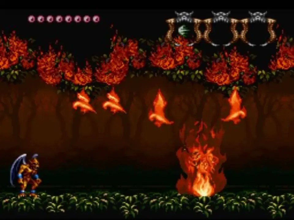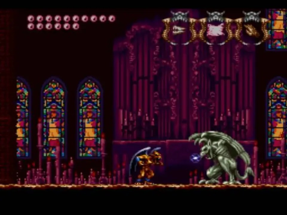 L’un des atouts majeurs de Demon’s Crest est sans doute son ambiance. Les graphismes sont particulièrement impressionnants pour l’époque, avec des décors gothiques détaillés et une palette de couleurs riche en tons sombres. Les arrière-plans sont variés et contribuent à l’immersion dans ce monde infernal et tourmenté. Chaque zone que Firebrand explore regorge de détails, que ce soit dans les ruines désolées, les forêts hantées ou les palais infernaux. L’animation fluide des personnages et des ennemis, ainsi que la présence de boss gigantesques, donne au jeu une esthétique à la fois macabre et majestueuse.