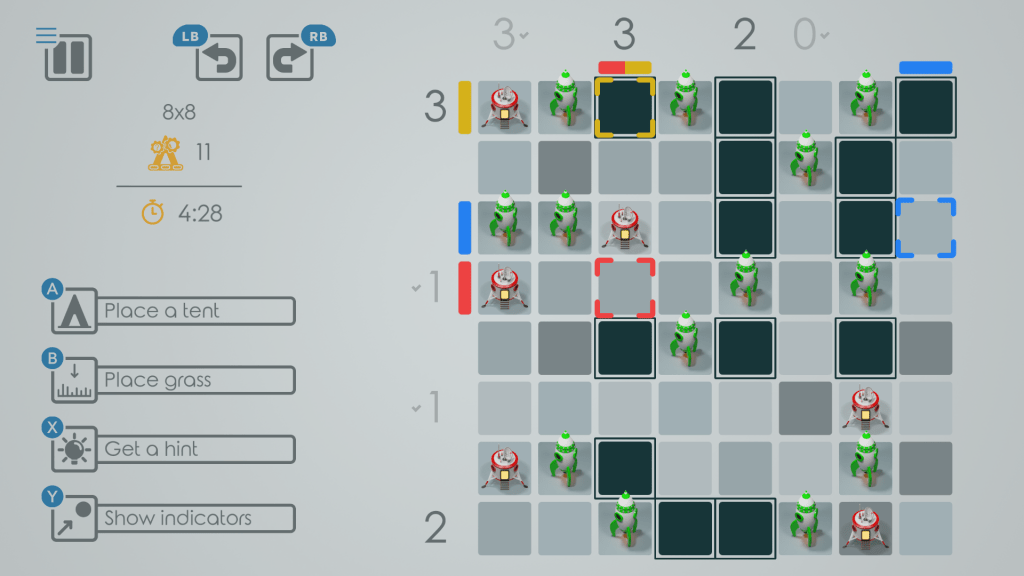 Le but du jeu est simple à comprendre. Vous avez une grille de forme carrée avec des numéros placés à chaque ligne, une ligne verticale et une ligne horizontale très semblable à un plan cartésien. Les chiffres indiqués sont le nombre maximum de tentes autorisées à être posées sur leurs lignes respectives. Vous devez installer les tentes alentour d’un arbre pour que le tout fonctionne. Une fois que les chiffres de la grille sont tous complétés, le niveau se termine automatiquement. Plus vous progressez dans les niveaux, plus la grille va devenir de plus en plus grande et surtout plus complexe à résoudre.