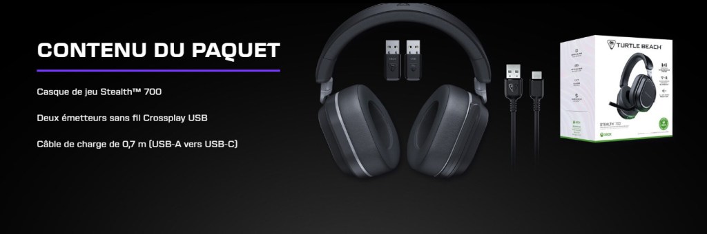 Dans la boîte, on retrouve également un câble USB-C standard pour recharger le casque. Turtle Beach promet une autonomie de plus de 80 heures de jeu. J’ai effectué deux charges complètes en calculant mon temps : j’ai obtenu 79 heures la première fois et 81 heures la seconde. Nous sommes donc bien dans les promesses annoncées. Les deux fois, il m’a fallu moins de deux heures pour que le casque atteigne sa pleine charge lorsqu’il était complètement déchargé.