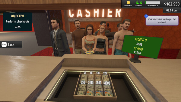 Vous commencez par un tutoriel expliquant étape par étape comment lancer votre casino. Au début de la partie, vous n’avez pas d’employés, ce qui signifie que vous devez vous occuper de la caisse et de la sécurité vous-même. Par la suite, il vous faudra sélectionner diverses machines de jeux. Au fur et à mesure que la partie progresse, vous pourrez agrandir votre entreprise, acheter d’autres machines et tables de jeux, et embaucher du personnel ainsi que des agents de sécurité. Gérez les finances de votre casino pour pouvoir, par la suite, vous développer. Plus vous achetez de jeux, plus la capacité de votre casino à recevoir des clients augmentera.