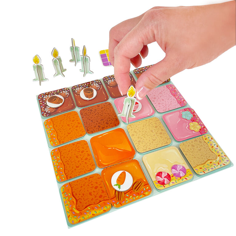 Sortez votre spatule ! Le but est de réaliser le gâteau rapportant le plus de points, pas nécessairement le plus beau. Le jeu se déroule en deux manches. Chaque joueur reçoit un plateau de jeu et une carte personnage. Le joueur dont l’anniversaire est le plus proche commence et reçoit la carte couteau. Disposez seize tuiles de gâteau face visible sur la table. Le joueur avec la carte couteau prend une carte de découpage et choisit comment les joueurs récupéreront leurs tuiles. Les cartes de découpage fonctionnent un peu comme des pièces de Tetris, donc une stratégie s’impose. Répétez cette action quatre fois par joueur, à tour de rôle, pour remplir votre plateau.