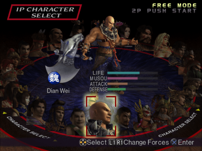 L’un des points forts indéniables de Dynasty Warriors 3 réside dans son chara design malgré un nombre de 41 personnages. Chaque personnage jouable possède une apparence unique et immédiatement reconnaissable, mêlant des éléments historiques à des touches fantaisistes. Ces designs permettent de distinguer clairement chaque héros, même sur un champ de bataille chaotique. Les costumes, riches en détails, reflètent à la fois la personnalité du personnage et son rôle au sein de son royaume. Les armes jouent également un rôle central dans l’identité visuelle de chaque combattant. De l’imposante hallebarde de Lu Bu à l’épée noble de Cao Cao ou aux élégants éventails de Sima Yi et Zhuge Liang, chaque arme est conçue pour être autant un outil de destruction qu’une extension du style du personnage. Ces armes emblématiques ne se limitent pas à l’esthétique : elles influencent directement le gameplay, ajoutant une variété bienvenue au combat. Ce souci du détail dans le design contribue à rendre chaque héros attachant et mémorable, et pousse le joueur à essayer de débloquer et maîtriser tous les personnages ainsi que leurs armes. Car chaque personnage possède 4 armes différentes, plus elle est puissante plus son design est intéressant. Il y a aussi des objets à collecter que vous pouvez ensuite équiper sur vos personnages pour améliorer certaines de leurs caractéristiques.