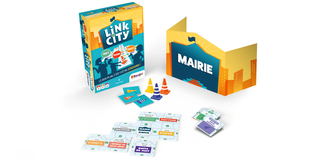 Link City est un jeu de société de 2024 créé par Émilien Alquier et distribué par Blue Orange Games. Conçu pour 2 à 6 joueurs, âgés de 8 ans et plus, d’une durée d’environ 30 minutes, il s’agit d’un jeu coopératif de construction de ville. Dans la boite il y a un livre de règles, un écran pour le Maire, 72 tuiles (57 localisation recto-verso, 1 hôtel de ville, 6 bonus, 8 cônes) et 4 petits cônes construction.