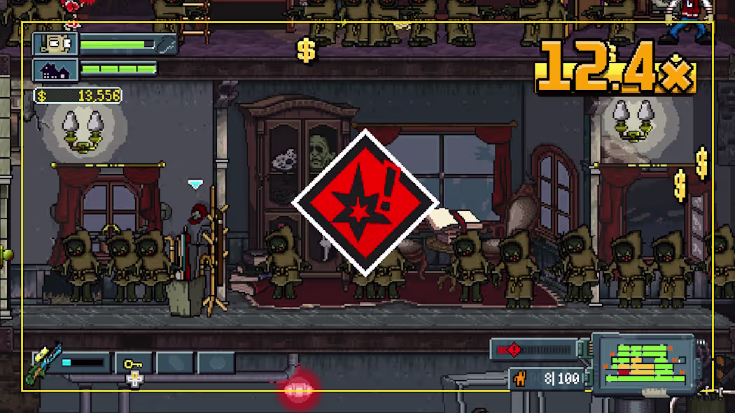 Le principe est simple : vous devez sauver des survivants dans un manoir abandonné infesté de monstres. Ce bâtiment est un véritable labyrinthe en 2D, et pour survivre, vous utilisez tout ce qui vous tombe sous la main : meubles, barre à cloue, bat de baseball, une tronçonneuse (oui, elles traînent là par hasard), et bien plus encore. En tout, plus de 60 armes sont disponibles, il suffit de les trouver et de s’en servir !