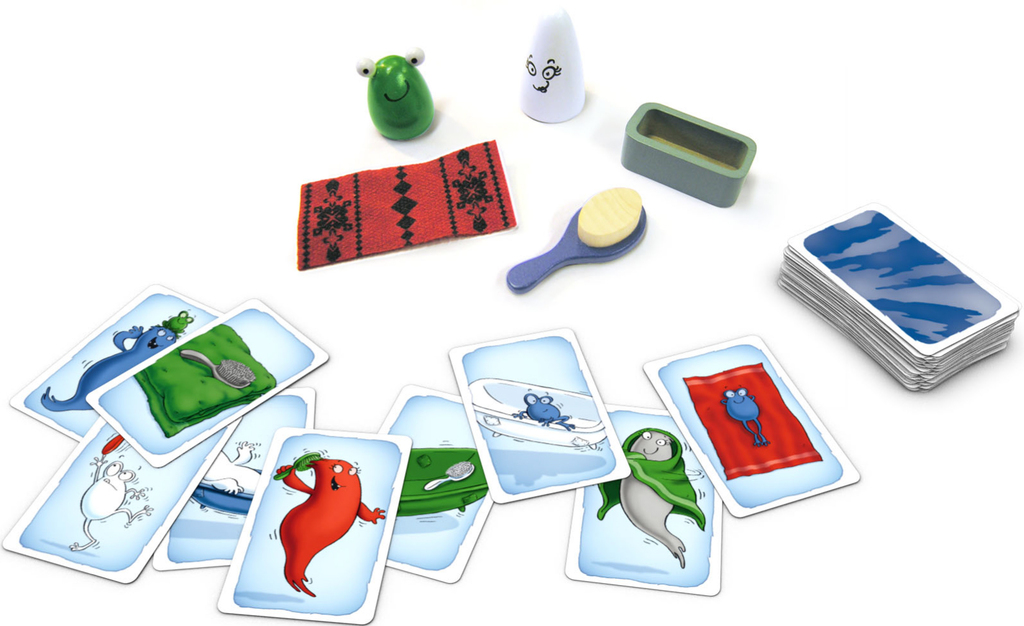 Dans Ghost Blitz 2, vous avez 5 figurines qui se retrouveront au centre de la table: un fantôme blanc, un bain gris, une brosse à cheveux bleue, une grenouille verte et une serviette rouge. Le but sera de trouver le plus rapidement possible lequel de ces objets se retrouvent sur la carte qui sera retournée à la vue de tous. Évidemment, le jeu vous mêlera avec des mélanges de formes et de couleurs. Par exemple, un fantôme bleu n’est pas la même chose que le fantôme blanc, et donc ne serait pas la bonne réponse. Le hic, c’est que certaines cartes ne comporteront aucune de ces figurines dans leur forme exacte. Il faudra alors trouver laquelle ne se trouve ABSOLUMENT pas sur la carte. Ainsi, pour reprendre l’exemple précédent, le fantôme bleu représente le fantôme, d’une part, mais aussi la brosse à cheveux, puisqu’ils partagent la même couleur, le bleu. La réponse se situera alors parmi les 3 autres figurines, selon ce qui sera représenté d’autre sur la carte.