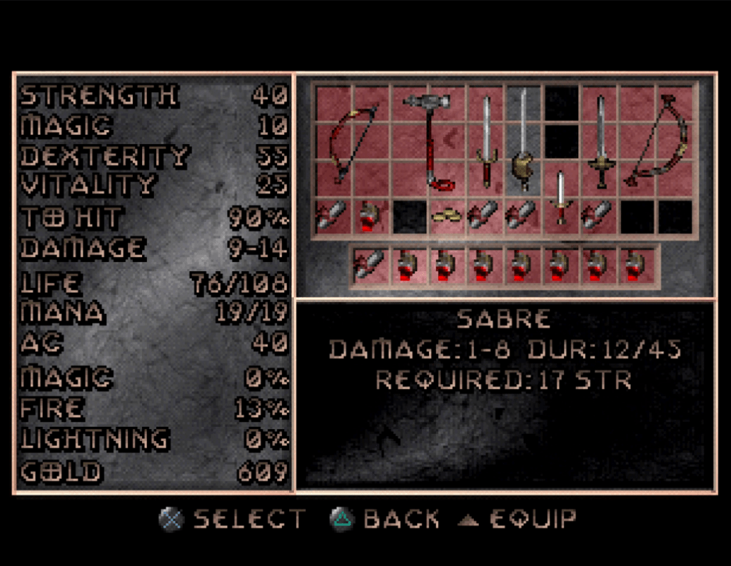 Sur le plan du contenu, la version PS1 reprend l’essentiel de la version PC. Les trois classes de personnage sont là : le Guerrier, le Voleur et le Sorcier. Les quêtes principales, les monstres emblématiques et les objets magiques sont également présents. Cependant, plusieurs limitations techniques ont obligé l’équipe de portage (Climax Studios, sous l’égide de EA) à faire quelques coupes.