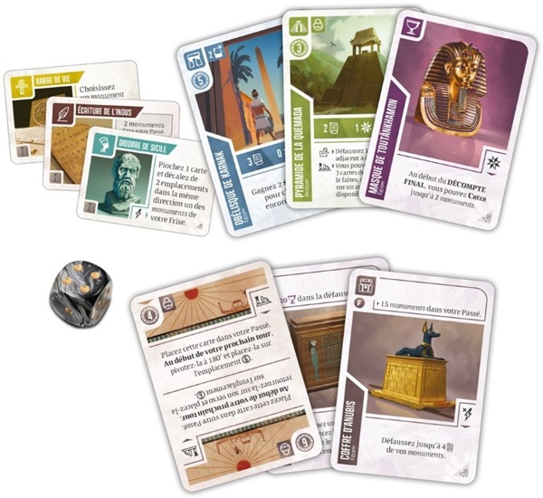 Heritage introduit 36 nouvelles cartes bâtisseur (27 cartes monuments et 9 cartes artéfacts) à ajouter au jeu de base. Ces cartes ajoutent une dimension supplémentaire à celles déjà présentes dans le jeu de base et permet de nouvelles approches et stratégies. Certaines d’entres-elles possèdent 2 effets, au lieu d’un seul. Si dans le jeu de base, une carte monument ne pouvait s’activer qu’à un moment précis (au moment de la jouer, durant la phase de chronique ou au moment de son déclin), certaines des nouvelles cartes peuvent s’activer à plus d’un moment. La carte possède alors 2 capacités qui viendront s’activer à différents moments durant son temps sur votre plateau de joueur. Si certaines de ces capacités peuvent paraître moins puissantes prises seules, la combinaison de 2 sur une même carte vient réellement changer la donne. La mécanique permet d’explorer de nouvelles stratégies qui auraient été plus compliquées par le passé.