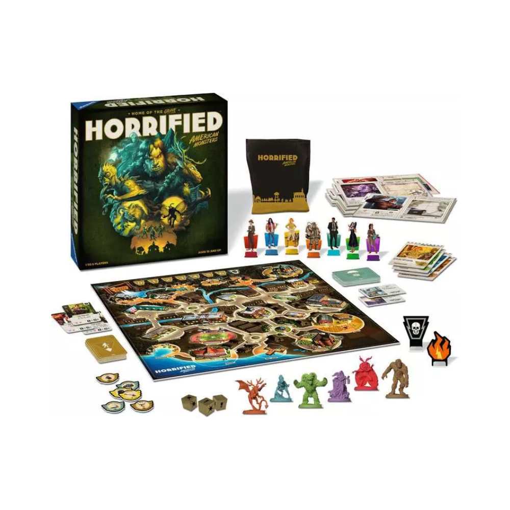Horrified est un jeu coopératif de 1 à 5 joueurs, où les participants incarnent des héros tentant de sauver une ville terrorisée par des monstres. Chaque partie propose une configuration différente selon le nombre de créatures que l’on choisit d’affronter, ce qui permet d’ajuster la difficulté. Le cœur du jeu repose sur le travail d’équipe : il faudra planifier, se répartir les tâches, sauver les villageois, et surtout trouver comment vaincre chaque monstre, car tous demandent une stratégie spécifique.