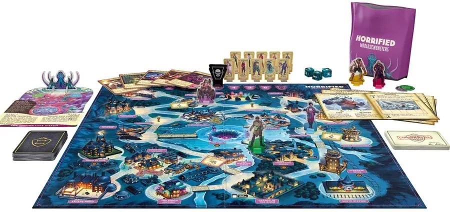 Installer une partie de Horrified est relativement simple. On commence par choisir les monstres à affronter (de deux à quatre selon le niveau de défi souhaité) et on place leurs figurines ainsi que leurs cartes spécifiques sur le plateau. Chaque monstre a des règles propres pour sa défaite : Dracula nécessite de détruire ses cercueils, la Créature du Lagon Noir doit être repoussée avec un sonar, et ainsi de suite. Cette asymétrie ajoute une richesse tactique à chaque partie.