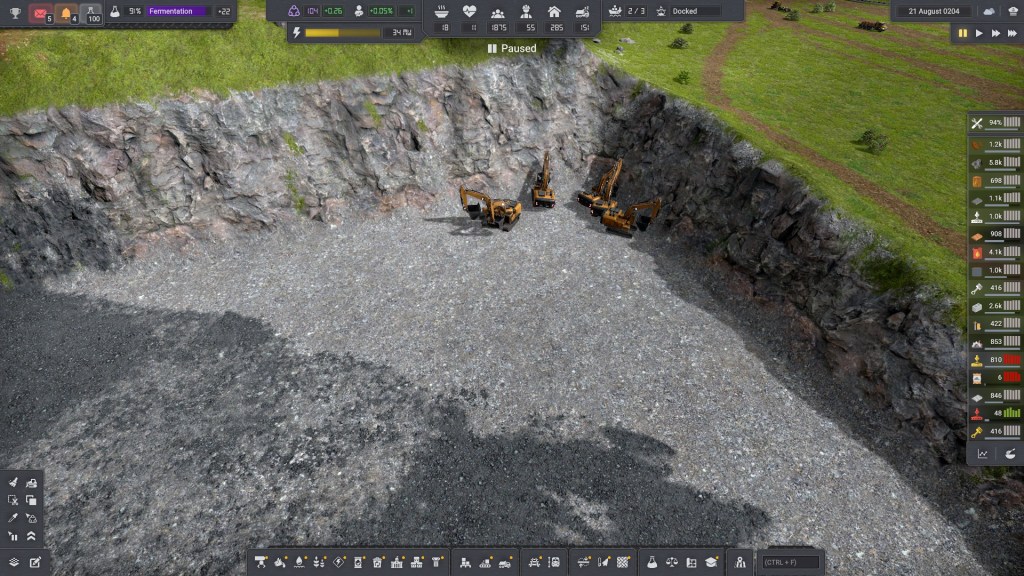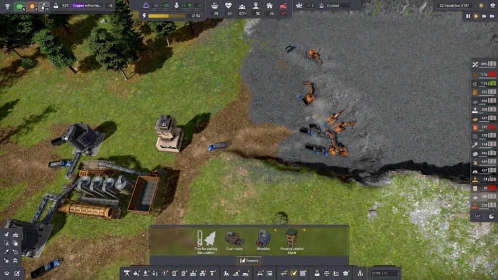 Il y a aussi un excellent système de terraformation et de minage qui permet à un joueur de refaire complètement son île. Avec de la patience et les bons véhicules, un joueur peut enlever n’importe quelle montagne qui se trouve dans son chemin ou ajouter du territoire sur lequel bâtir ses industries. L’extraction de ressources minières est faite en désignant des zones de minage où le joueur ordonne à ses machines d’enlever couche par couche les matières premières, de manière très similaire à une mine à ciel ouvert moderne. Il faut d’ailleurs prendre en compte la logistique du minage, puisque les véhicules peuvent rester pris si on oublie de prévoir des chemins d’accès adéquats.