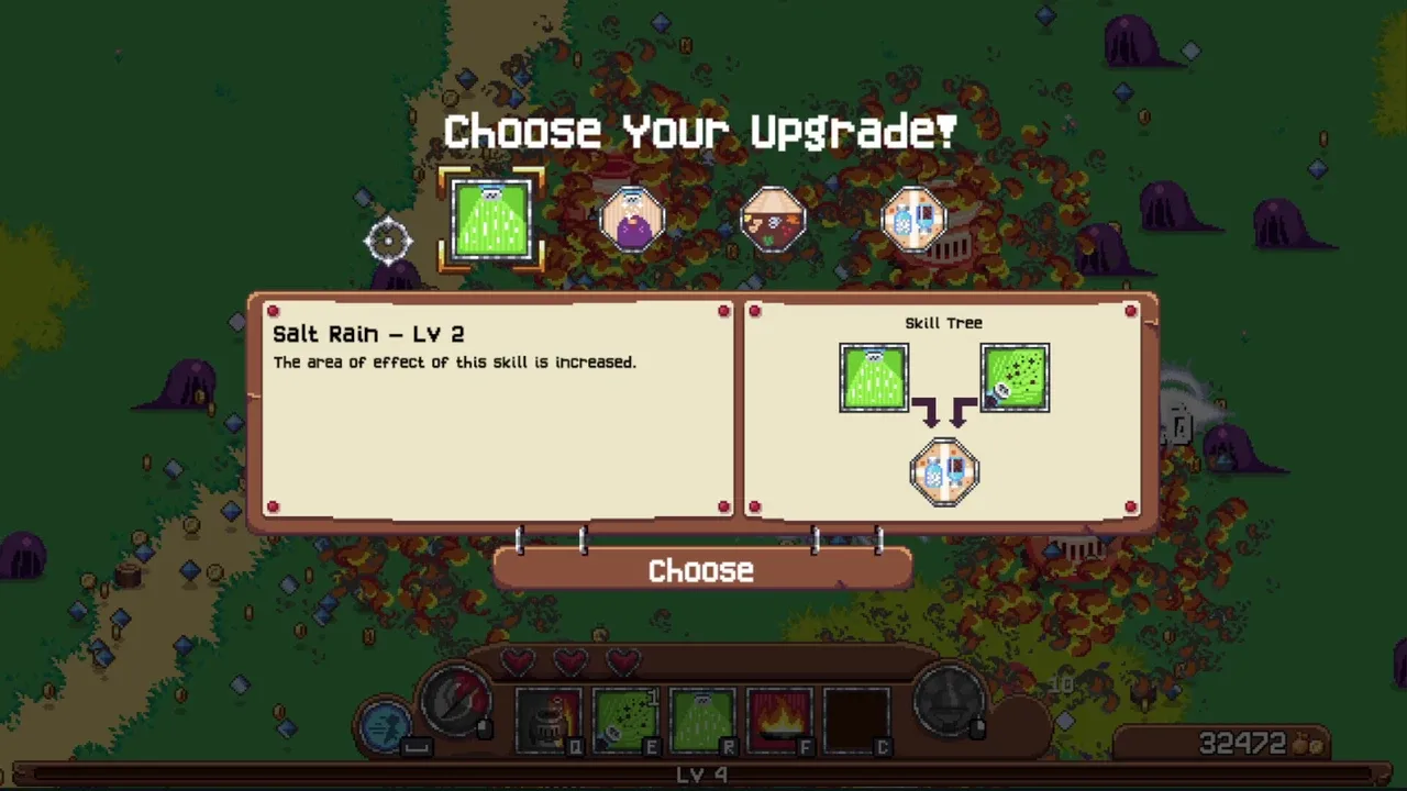 À chaque montée de niveau, vous pouvez choisir une attaque ou un bonus passif. Les attaques ont plusieurs niveaux d’amélioration, et chaque personnage possède ses propres attaques uniques. Par exemple, le personnage principal est un chef cuisinier. Ses attaques incluent un poêlon géant aspirateur, le lancer de couteaux, ainsi qu’une combinaison d’attaques au sel et au poivre. Ce ne sont que quatre attaques, mais certaines sont très puissantes. En jouant régulièrement, vous découvrirez des combinaisons très efficaces.