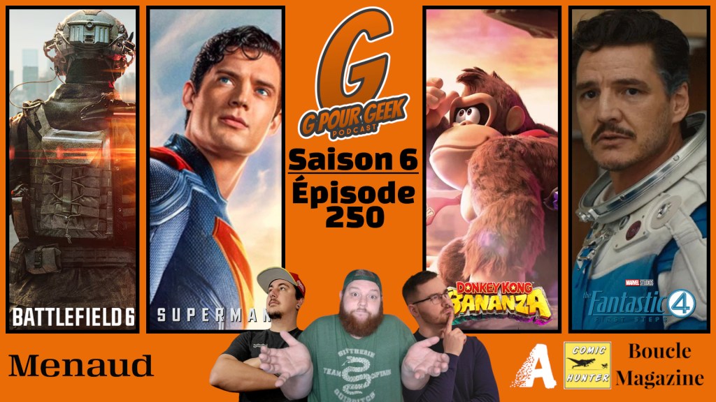 #GPourGeek #PodcastGeek #GeekCulture #PopCulture #RetourDeVacances #Episode250 #Menaud #AlienEarth #Wednesday #Batman #Superman #Sandman #TwistedMetal #Battlefield6 #JurassicWorld #DonkeyKong #HappyGilmore2 #Wakanda #SuperMarioParty #LaGuerreDesMondes #HenryPisSaGang #FantasticFour