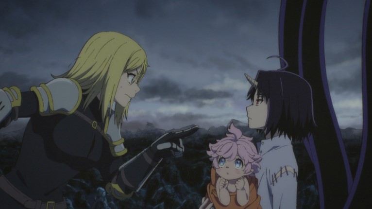 Toutefois, malgré cette ambiance lourde, l’univers reste incroyablement fascinant grâce à ses détails soignés, ses créatures uniques et ses paysages empreints de mystère. Chaque décor, qu’il s’agisse d’une cité en ruines ou d’une plaine hantée par la magie, semble dégager une histoire unique, renforçant l’impression d’un monde bien vivant malgré la désolation! Mais ce qui rend cet univers réellement captivant, c’est la manière dont il place ses protagonistes au cœur d’un dilemme moral constant : Clevatess, ce monstre vengeur et souverain de la destruction, observe l’humanité à travers les yeux d’un enfant, incarnant à la fois sa possible rédemption et sa condamnation. Alicia, notre héroïne déchue et réduite en esclavage, devient quant à elle la gardienne involontaire de ce fragile espoir, alternant entre résignation et instinct protecteur… C’est également cette capacité à placer sans cesse l’humanité sur un fil précaire qui fait de l’anime une aventure exceptionnelle! À chaque décision, l’avenir peut basculer entre lueur d’espoir et chute irrémédiable dans les ténèbres… Un équilibre fragile, sans cesse remis en cause, qui donne au récit — et aux spectateurs — une intensité dramatique constante!
