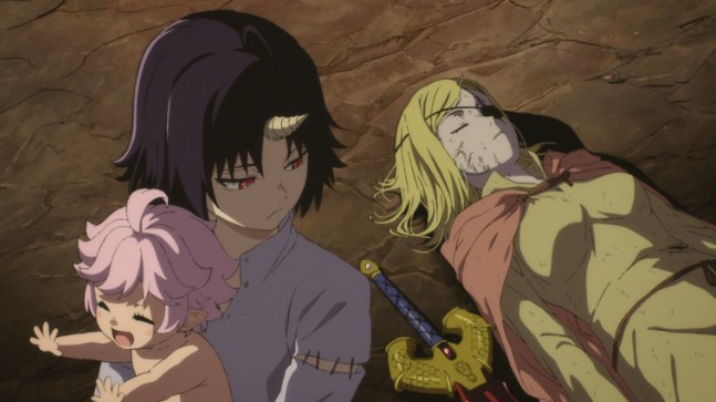 Pour ajouter à cet univers sombre et à l’ambiance de « dark fantasy », l’animation de Clevatess adopte un style volontairement vieilli, qui renforce véritablement cette atmosphère sombre et oppressante, parfaitement fidèle à l’identité du récit! Cette caractéristique pourrait, certes, faire reculer certains amateurs habitués au style plus spectaculaire des nouveaux animes, mais elle apporte, au contraire, toute son importance à l’histoire… Les traits légèrement granuleux, les couleurs parfois délavées et les textures moins lisses que dans les productions modernes ajoutent beaucoup à cette volonté de classicisme, comme si l’on contemplait un récit intemporel! Et ce choix esthétique n’est pas qu’une simple nostalgie : il souligne, au contraire, toute la gravité des événements et l’austérité du monde, tout en donnant aux scènes d’action et aux interactions émotionnelles une puissance visuelle supplémentaire! Ainsi, ce choix est loin de nuire à l’immersion selon moi. Ce style vieilli confère même merveilleusement bien à l’œuvre une identité unique, qui se démarque clairement de tous ces nouveaux animes tape-à-l’œil!
