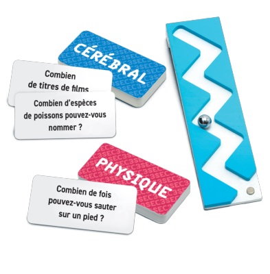 Le jeu amène une dynamique intéressante avec sa piste de temps. Les coups que donne la bille sur les parois de la piste en descendant sont un rappel brutal au joueur du temps qui passe et ça ajoute un stress au défi qui n’existe pas dans d’autres jeux. Ceci dit, la mécanique autour de la piste de temps est aussi le grand défaut du jeu. Je n’ai pas aimé que le joueur aie à bloquer l’aimant avec son doigt avant que la bille ne clique pour relever le défi. C’est une action de plus à réaliser qui fait en sorte que le joueur ne dispose pas réellement de 3 secondes, mais de moins encore. Si pour les défis cérébraux, on n’y verra pas tellement de différence (on peut maintenir son doigt au dessus de la piste en même temps de relever le défi), pour les défis physiques, c’est une autre histoire: le joueur doit se garder du temps pour revenir près de la table, ou se replacer correctement, pour bloquer la bille. Ce qui fait en sorte que le 3 secondes alloués est vraiment plus comme un 2 secondes (et encore, selon les défis, ça peut être moins). Bref, même si la mécanique de la piste de temps avec la bille est une bonne idée, son application laisse à désirer, à mon avis. Une solution que nous avons appliquée durant ma séance de jeu, c’est d’ignorer ce règlement et de se fier uniquement au bruit de la bille qui clique sur l’aimant. L’expérience était plus agréable de cette façon pour nous.