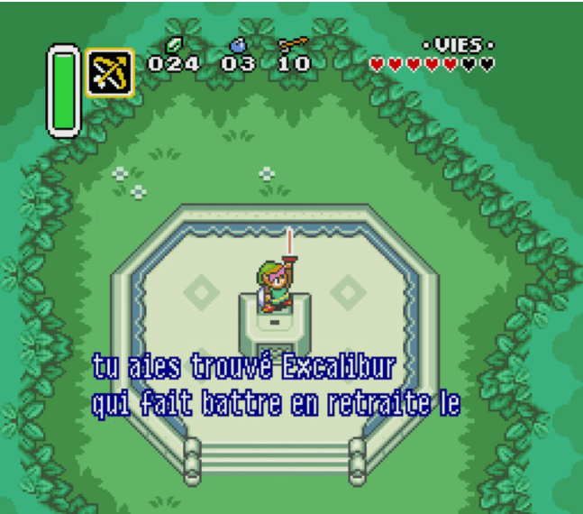 N.B. : Je dois absolument mentionner que je me souviendrai toujours de la version française Québécoise qui avait renommé la Master Sword en Excalibur !