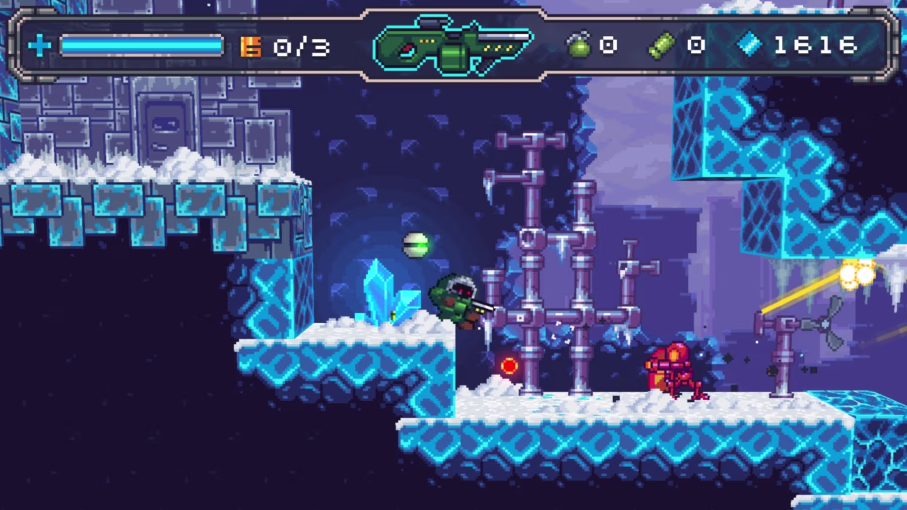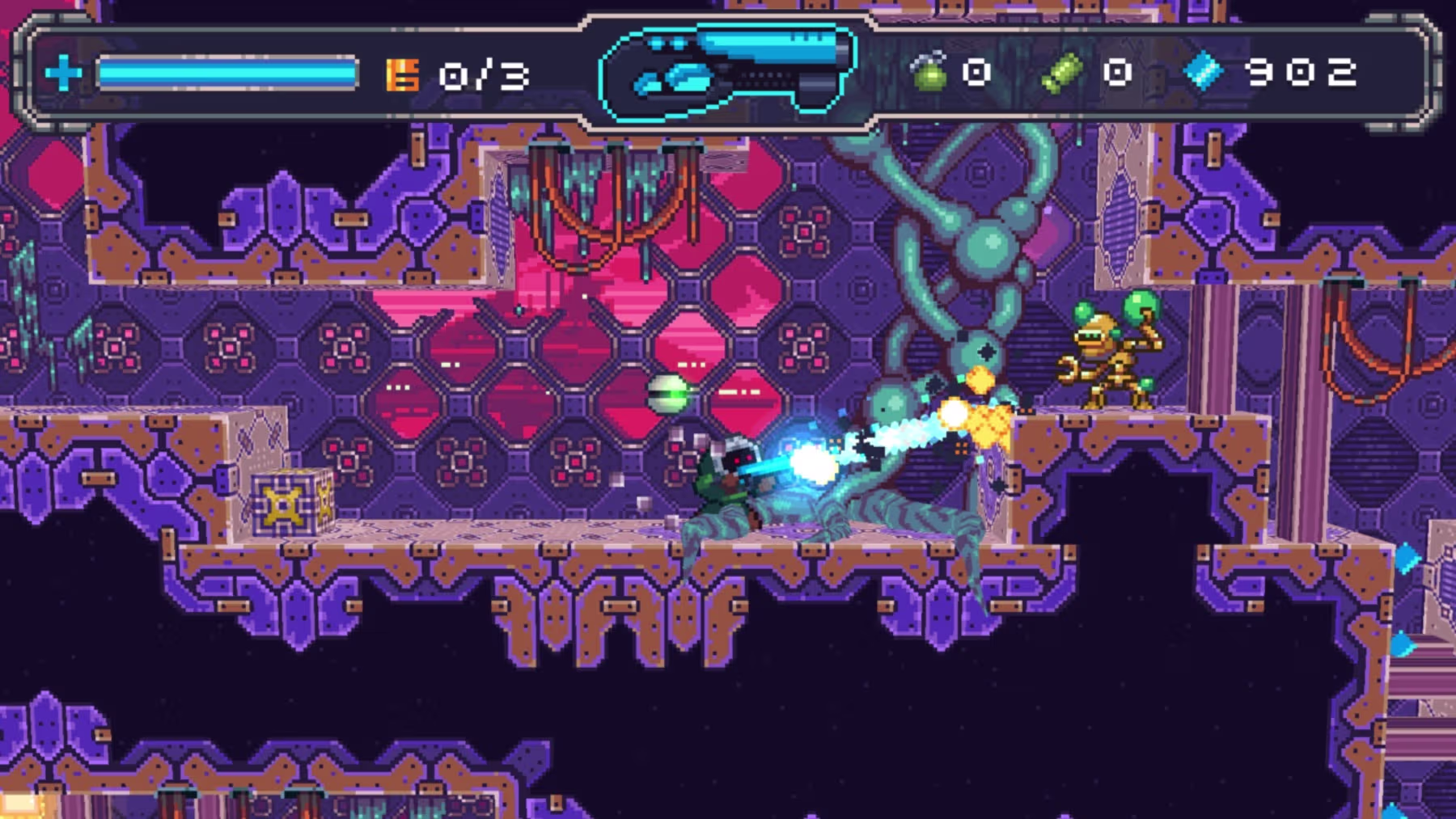 Sur le plan du gameplay, on retrouve les bases du jeu de plateforme classique : sauter, esquiver, combattre et collecter. Cette jouabilité enrichit les mécaniques grâce à un système de progression. Les objets récoltés permettent d’acheter de nouvelles armes et d’améliorer le drone assistant, un compagnon particulièrement utile dans les combats contre des vagues d’ennemis.