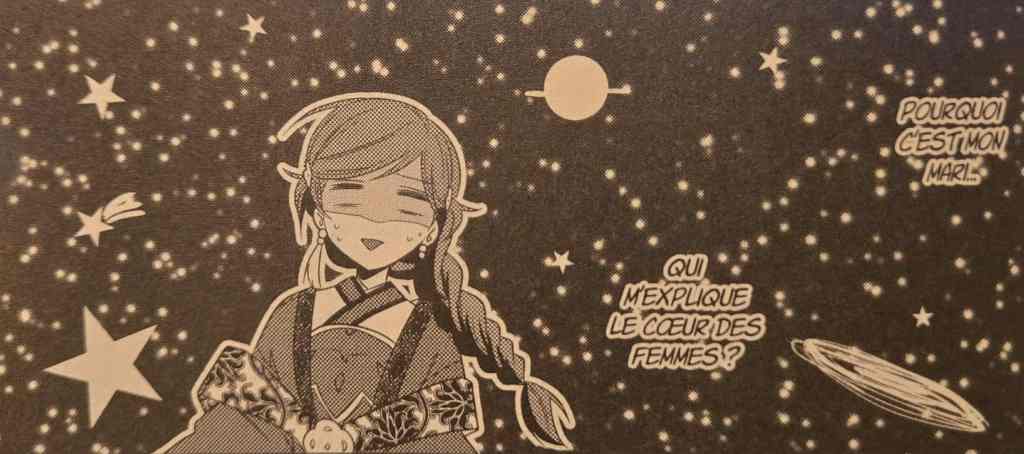 Après nous avoir présenté un peu les grandes lignes de nos personnages principaux, ce tome va finalement approfondir certains personnages, notamment Yuran et son mari Kogetsu, ainsi que des personnages secondaires qui auront une grande influence sur le récit! La relation entre nos mariés, déjà complexe, évolue, dévoilant des aspects inattendus de leur personnalité et de leur passé… Kogetsu et son côté travesti ajoute une dimension intrigante à l’histoire, tandis que Yuran démontre une résilience et une intelligence remarquables face aux défis qui se présentent à elle. On apprend également que l’empereur semble bien aimer jouer avec les gens, en particulier avec notre chère Yuran, en lui faisant passer trois épreuves inconnues afin qu’elle puisse maintenir sa position… et son mariage! Quel sera donc le prochain défi de notre mariée?