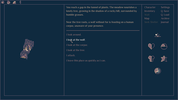 Roadwarden est une aventure qui se déroule entièrement par écrit avec quelques illustrations des endroits que l’on visite en un joli pixel art dans les tons sépias. Une trame sonore d’ambiance nous plonge également dans ce monde fantastique glauque.