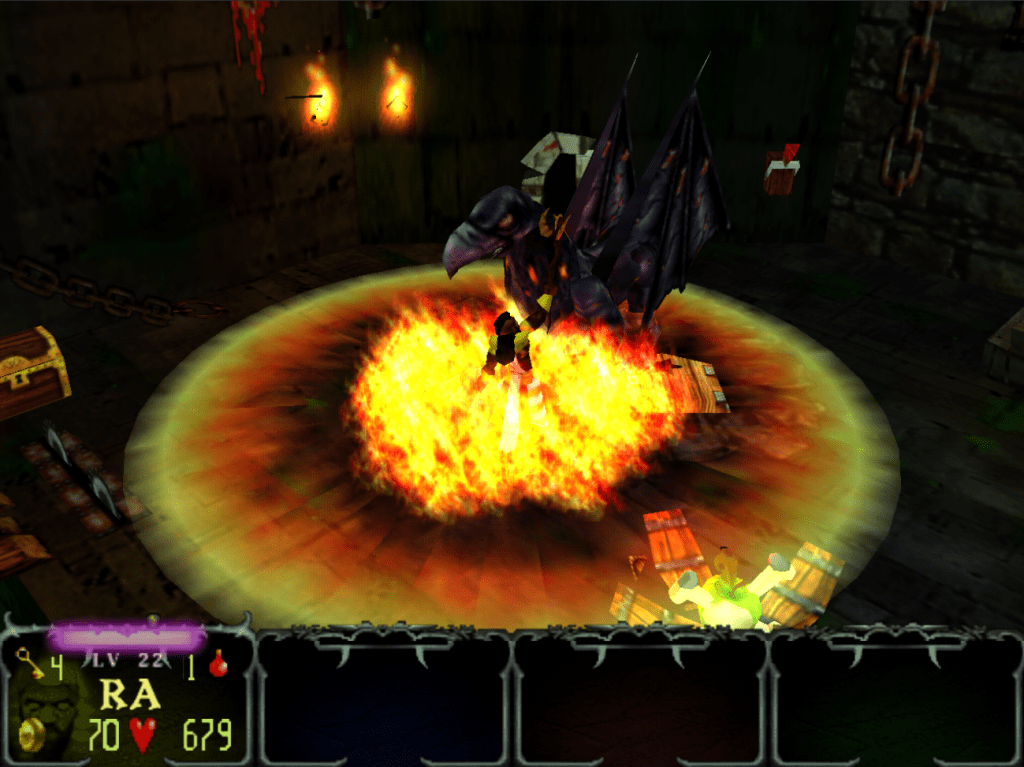 Une des mécaniques marquantes est la présence de boss optionnels. En fait ce sont les boss de fin de chaque monde mais leur point faible nécessite un objet précis que l’on n’a pas forcément encore acquis. Cette idée de devoir revenir plus tard, une fois mieux préparé, donnait un sentiment de progression et d’accomplissement rarement atteint dans les hack’n’slash de l’époque. Cela brisait la monotonie et incitait à explorer chaque recoin pour être sûr de ne rien manquer.