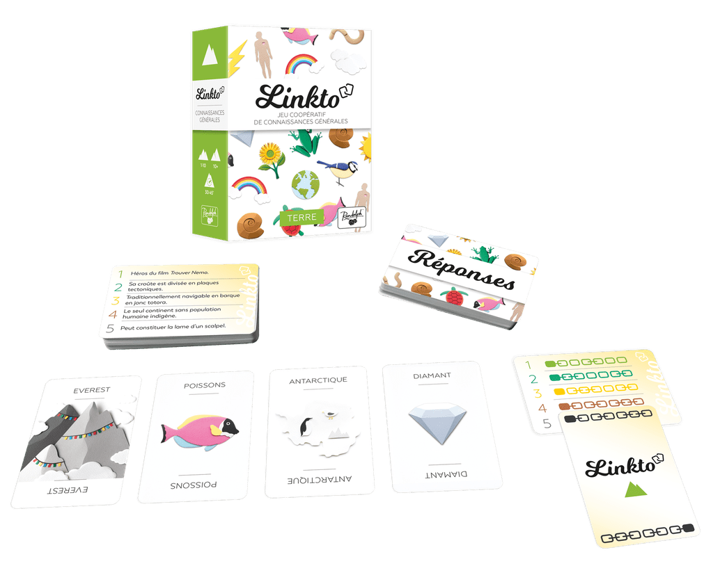 Linkto est un jeu d’énigmes et d’associations de mots dans lequel le but est de trouver le bon mot code à la fin de la partie. Il existe plusieurs variétés du même jeu; ici, la version Terre est celle qui est testée. Les énigmes tournent autour de la planète, des animaux et des plantes, etc. Linkto est un jeu édité par Randolph pour 1 à 10 personnes de 10 ans et plus, pour des parties de 30 à 45 minutes.