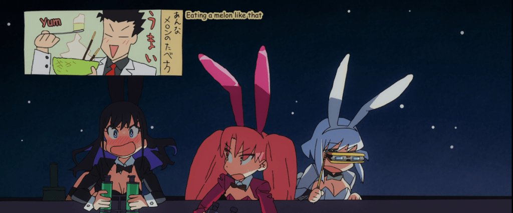 Également, cette animation rend la série très immersive. Puisque Marin et Gojo font des cosplays inspirés des séries qu’ils visionnent dans leur univers, on les voit regarder des séries ensembles ou jouer à des jeux ensemble. Les animateurs de Cloverworks ont fait l’effort très remarquable de donner un style distinctif à chacune des séries et jeux que nos personnages regardent ou jouent. Par exemple, un des jeux que les personnages jouent utilise un style visuel nous rappelant les visual novels tandis qu’un autre épisode commence avec une scène d’un anime que Marin et Gojo regardent. Le style est tellement différent qu’on a l’impression initialement de regarder une autre série complètement avant que l’anime nous montre que c’est nos personnages qui regardent quelque chose.