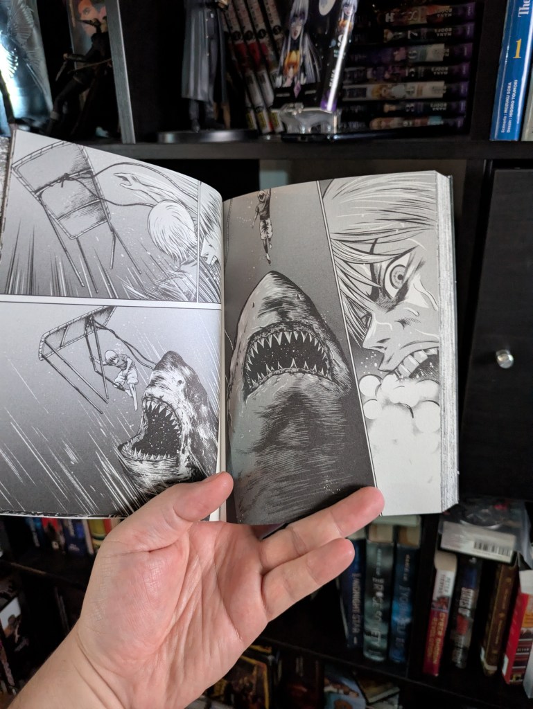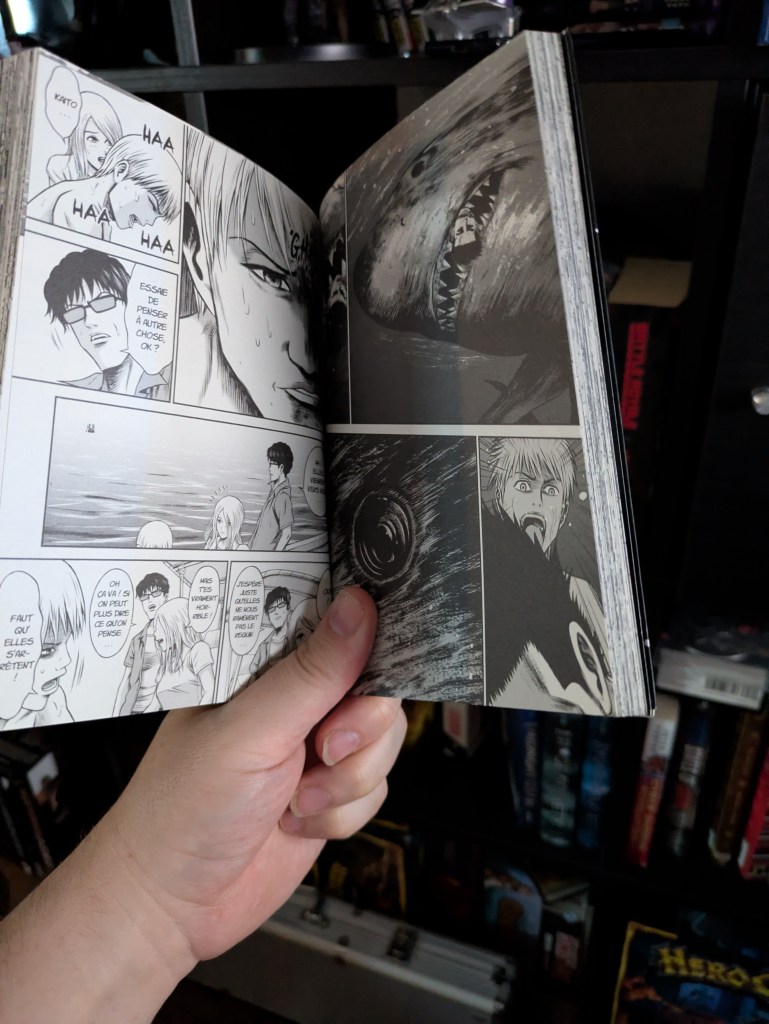 Quel thriller palpitant ! J’ai vraiment eu l’impression de revivre Jaws de Spielberg, mais version manga. Et je dois dire qu’il est vraiment difficile de recréer l’ambiance anxiogène d’un requin qui rôde autour de soi.