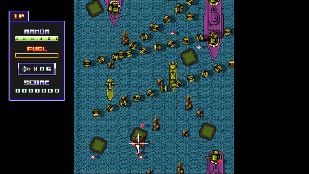 Vous n’aurez pas trop de mal avec les commandes, puisqu’on utilise seulement trois boutons : A pour la mitrailleuse, B pour les missiles et le joystick pour se déplacer. Le jeu ne contient que cinq missions de campagne, et une fois celles-ci complétées, vous aurez accès à trois petits modes supplémentaires : Rapide, Remix et Survie. Rien de vraiment nouveau en termes de niveaux, simplement une difficulté un peu plus élevée et quelques variations d’ennemis. L’histoire est racontée à travers quelques images fixes et du texte, et reste elle aussi assez simpliste, sans véritable développement narratif.