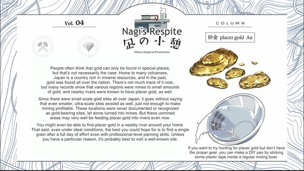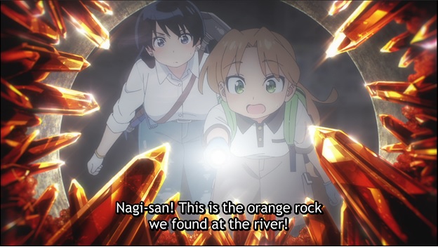 Ruri Rocks cherche aussi à nous éduquer sur les pierres précieuses et les minéraux. Le mangaka, Shibuya Keiichirou, est en fait quelqu’un qui a étudié la minéralogie et qui a commencé à dessiner des mangas durant ses études. Cela se traduit par des informations très précises sur cette science quand Nagi ou Imari nous présentent des faits sur les différentes pierres et minéraux que nos personnages cherchent ainsi que les techniques employées pour les trouver et les extraire. Ces informations couvrent aussi d’autres faits intéressants comme comment les minéraux sont formés ou comment nous les utilisons. Chaque épisode comporte aussi un moment appelé “Nagi’s Respite” où on a droit à des informations plus complètes sur ce que nos personnages cherchent durant cet épisode. Je tiens d’ailleurs à souligner l’excellent travail de l’équipe de traduction de Crunchyroll pour avoir traduit chacun de ces moments avec grands soins, nous aidant à bien comprendre ce que l’anime présente.
