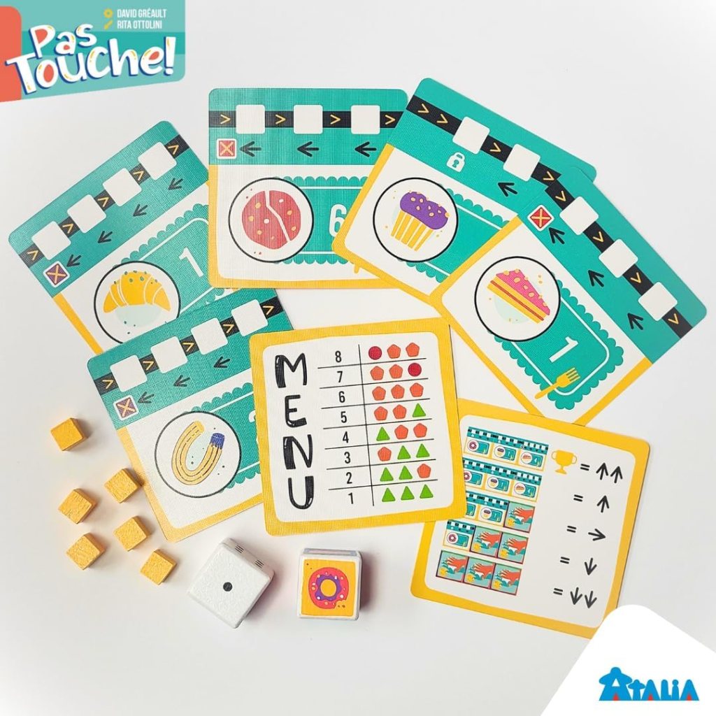 Les illustrations sont claires et reconnaissables, facilitant l’identification rapide des pâtisseries. De plus, le dé est intégré dans la boîte, sans autocollants, ce qui assure une meilleure durabilité à long terme. Pour toutes ces raisons, je donne un 8,5 sur 10 à Pas Touche!, un jeu qui allie amusement, stratégie et accessibilité pour petits et grands.