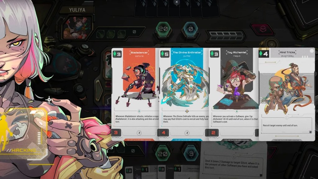 The Lost Glitches est un jeu de cartes PvP dans lequel les joueurs peuvent s’affronter en duel avec des decks de virus (serviteurs) et logiciels (sortilèges) pour vaincre votre adversaire. De toute évidence, on parle ici d’un clone du célèbre jeu Hearthstone avec quelques mécaniques différentes et une saveur cyberpunk : amenez un deck de 35 cartes et utilisez la meilleure stratégie.