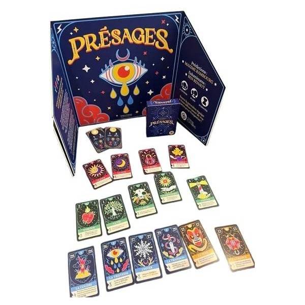 Présages est un jeu de cartes pour 4 à 6 joueurs de 10 ans et plus et pour des parties d’environ 30 minutes. Dans ce jeu, deux ou trois équipes devront tenter de gagner deux manches. Comment fait-on pour gagner une manche ? C’est simple : il faut qu’à la fin d’un tour un joueur de son équipe n’ait qu’une seule carte en main.