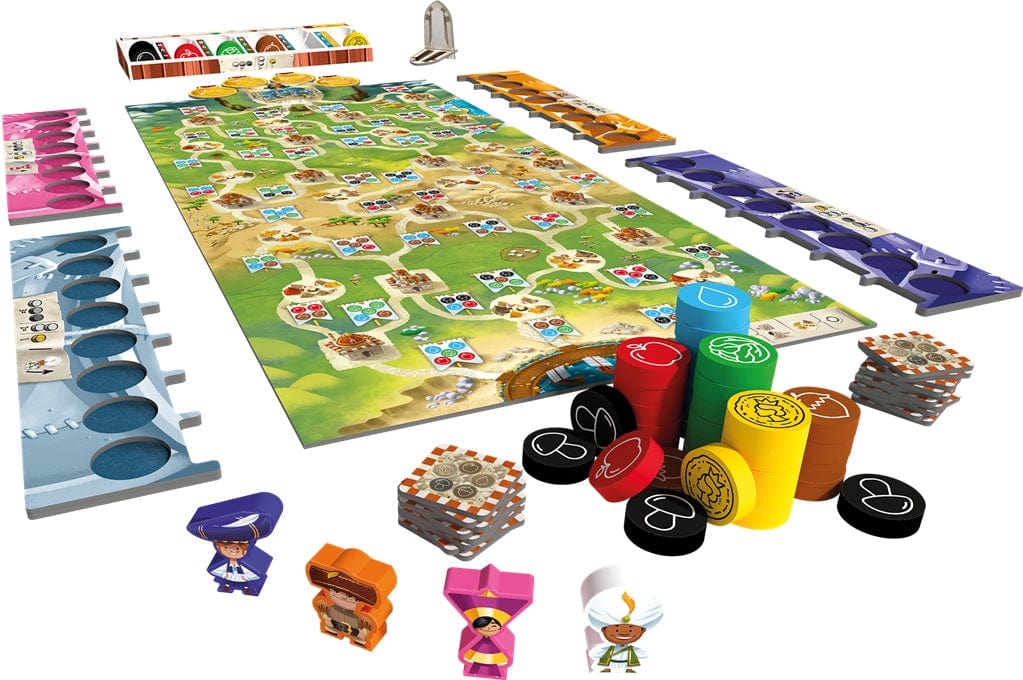 À leur tour, les joueurs ont deux possibilités : prendre des ressources ou utiliser des ressources pour avancer sur le plateau. Lorsqu’un joueur prend des ressources, il choisit parmi celles disponibles dans la réserve et les ajoute à ses jetons personnels. Ces ressources représentent ce dont il aura besoin pour nourrir les habitants du royaume et progresser vers la ville. Lorsqu’il décide d’utiliser ses ressources, il peut nourrir un habitant et déplacer son pion d’une ou plusieurs cases selon le nombre de ressources dépensées.